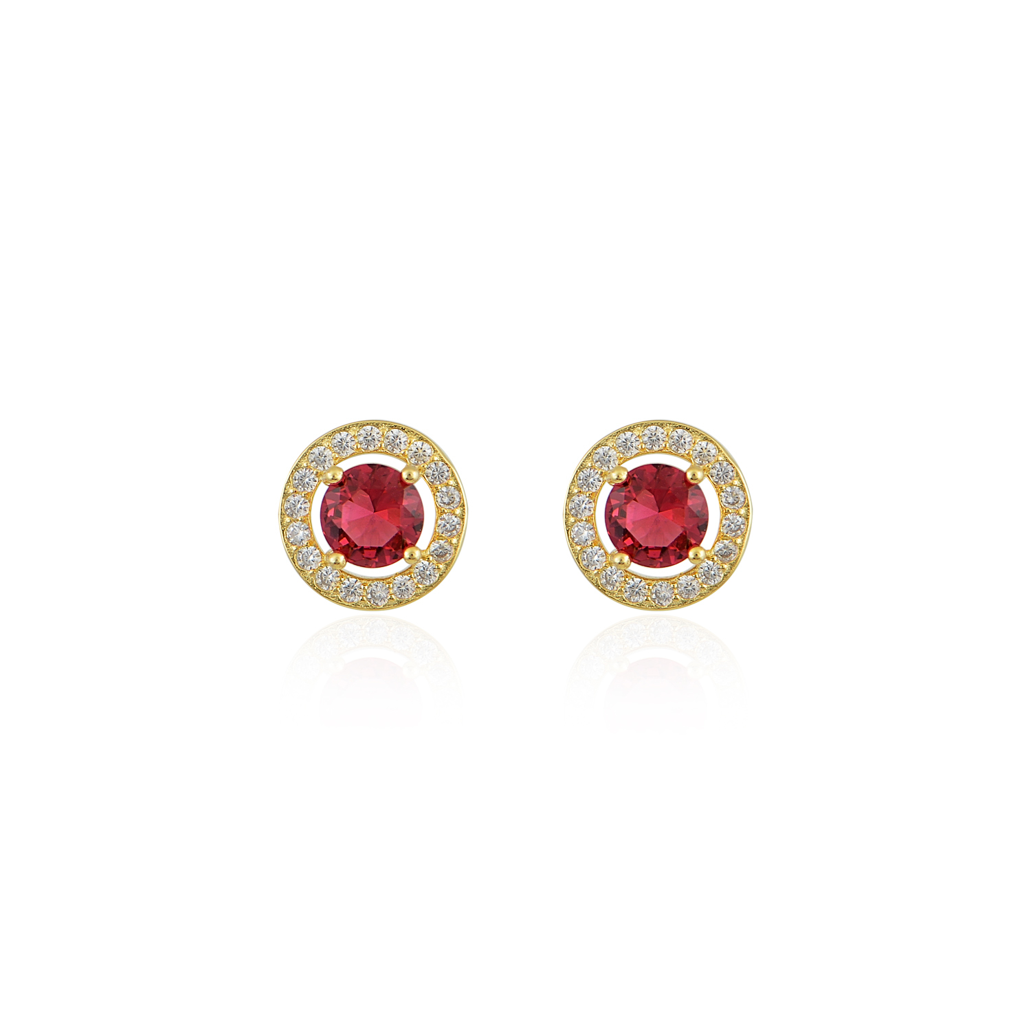 Καρφωτά σκουλαρίκια από επιχρυσωμένο ασήμι 925 με μια μεγάλη ρουμπινί πέτρα ζιργκόν στο κέντρο και μικρότερες λευκές περιμετρικά.
