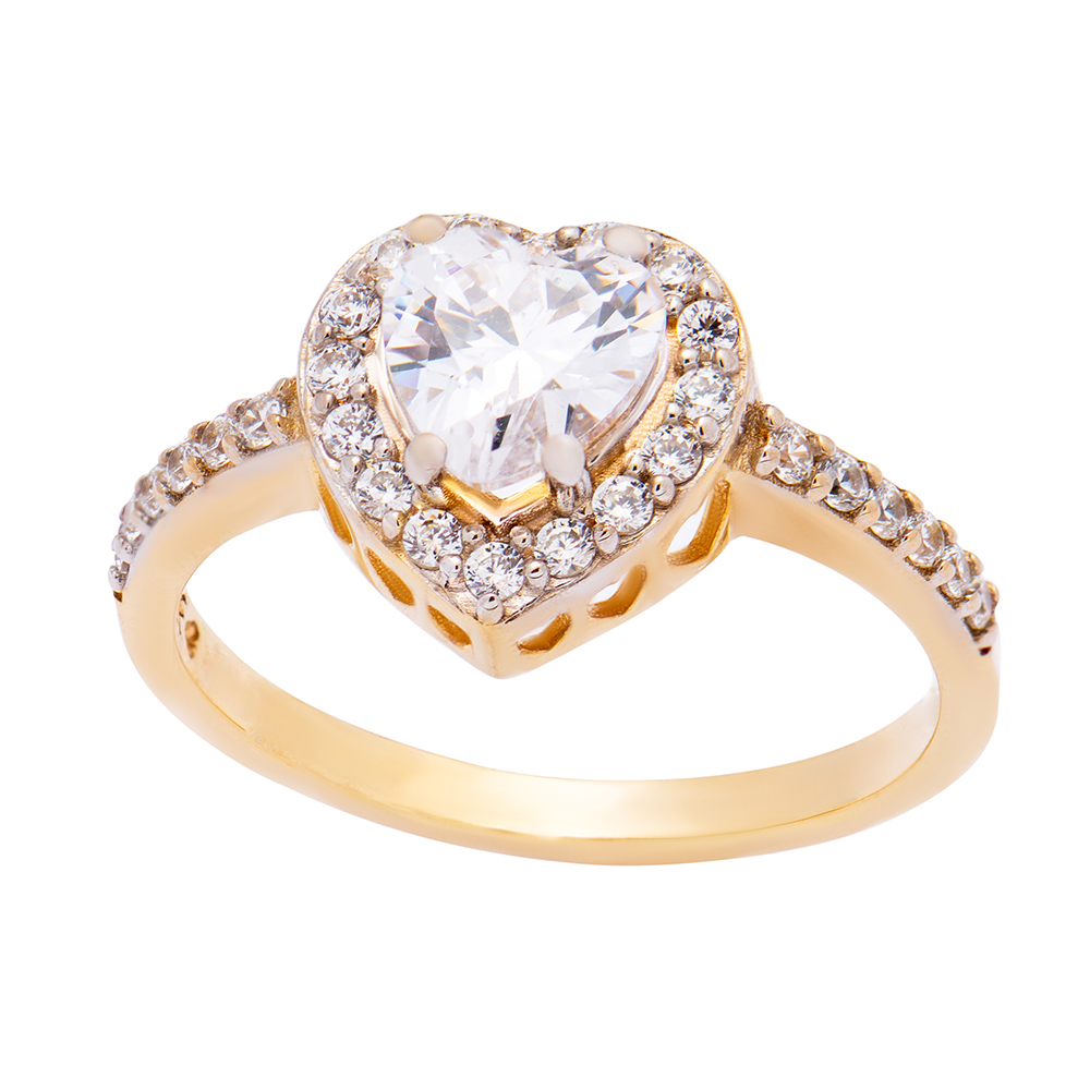Χρυσό δαχτυλίδι 14 καρατίων σε σχήμα κοπής καρδιά στολισμένο με λευκές πέτρες ζιργκόν.