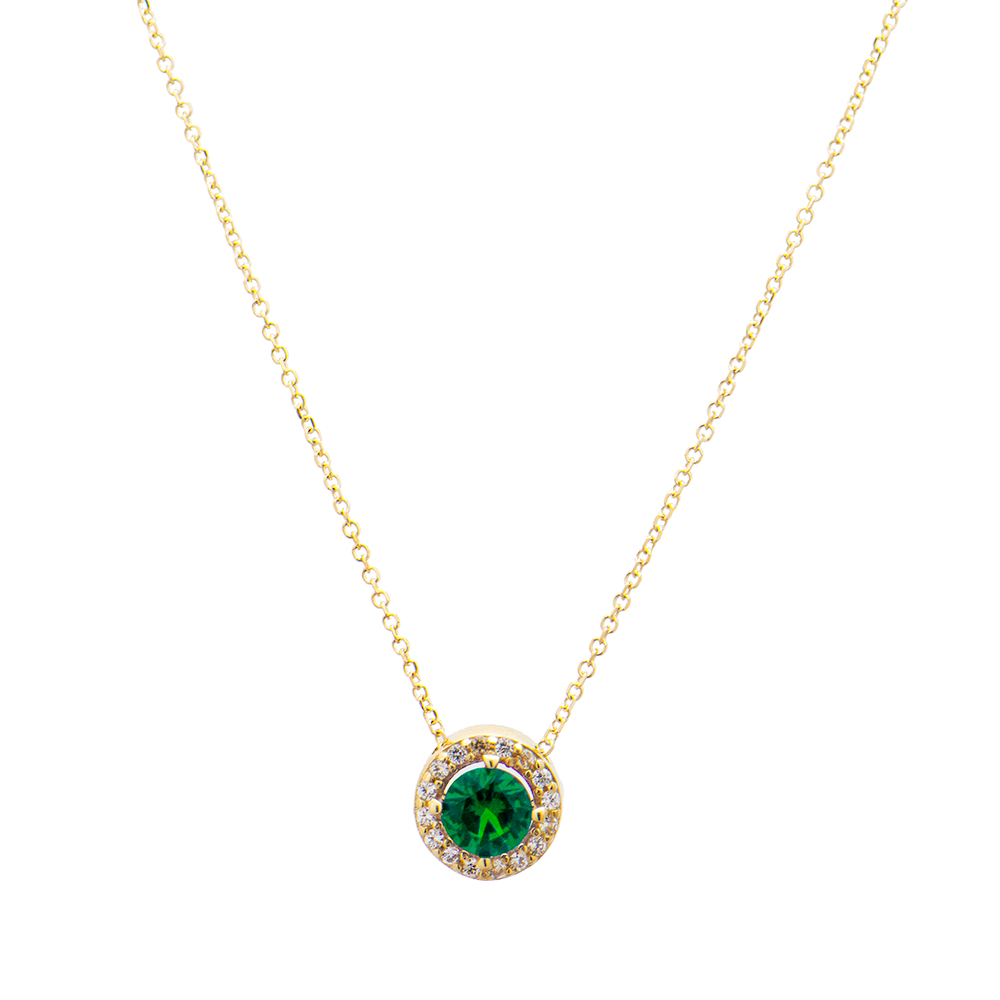 Χρυσό κολιέ 9 καρατίων με πράσινη πέτρα ζιργκόν στο κέντρο και περιμετρικά της μικρότερες λευκές πέτρες.