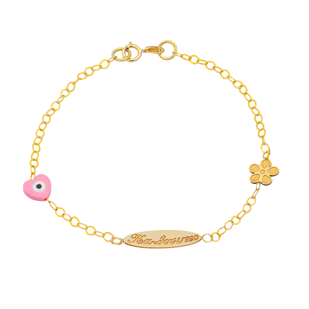 Χρυσό παιδικό βραχιόλι 9 καρατίων χαραγμένο ”Καλότυχο”, στολισμένο με ένα ροζ ματάκι καρδιά και ένα λουλούδι.