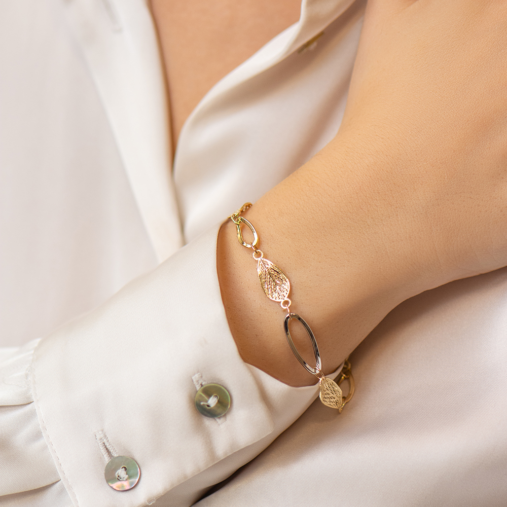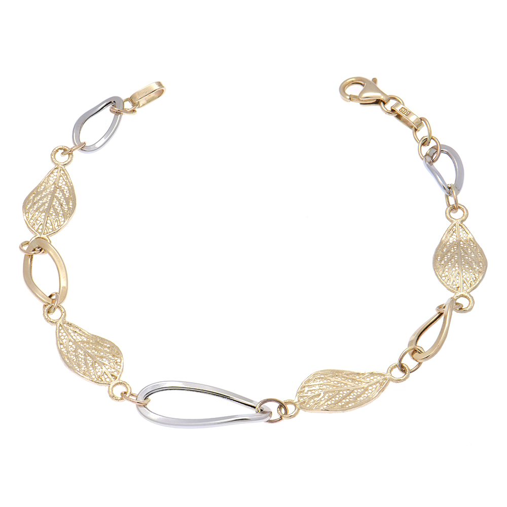 Χρυσό βραχιόλι 14 καρατίων αλυσιδωτό, δίχρωμο με διάτρητα φύλλα.