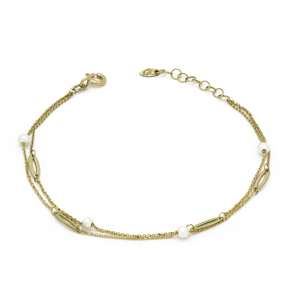 Χρυσό βραχιόλι 14 καρατίων διπλή αλυσίδα με μαργαριτάρια και οβάλ στοιχεία.