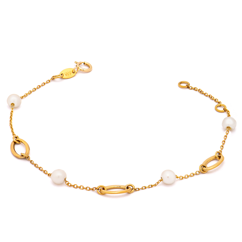 Gold bracelet 14 karats with oval rings and freshwater pearls.