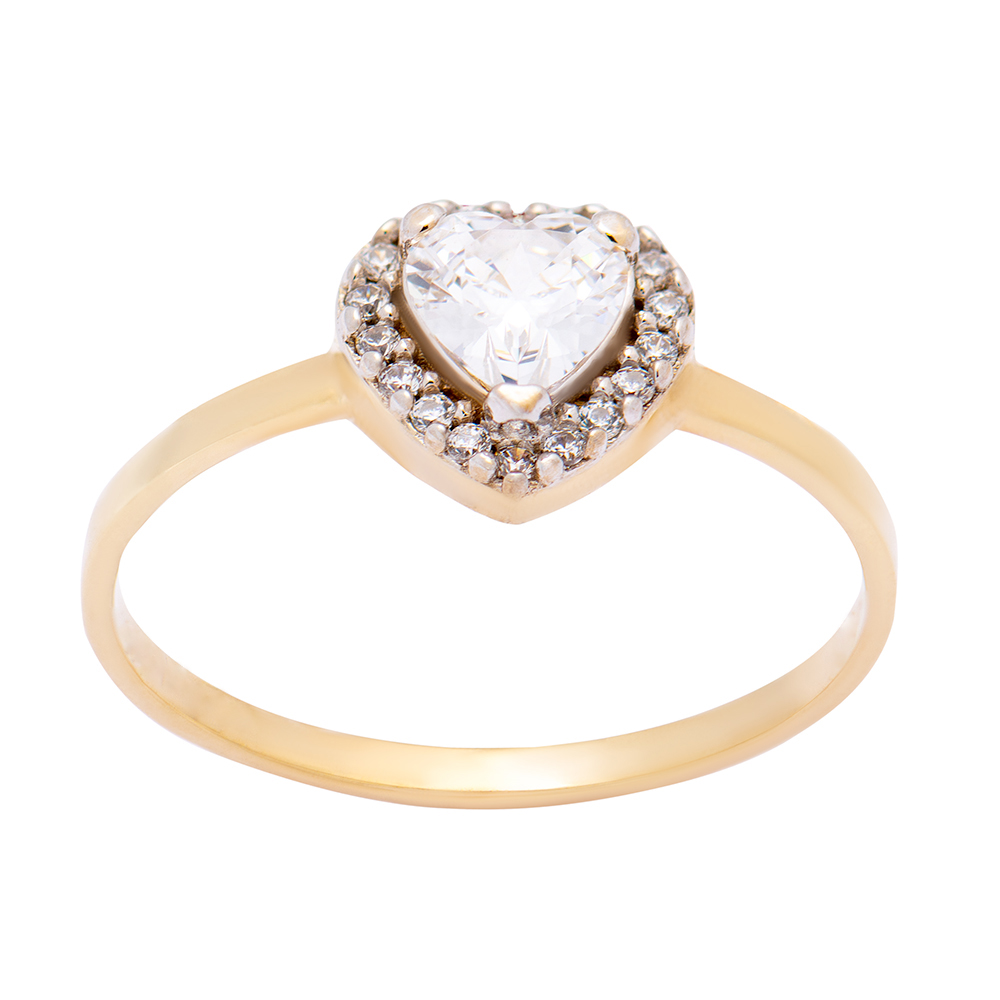 Gold ring 9 karats heart shaped adorned with white zircon stones.