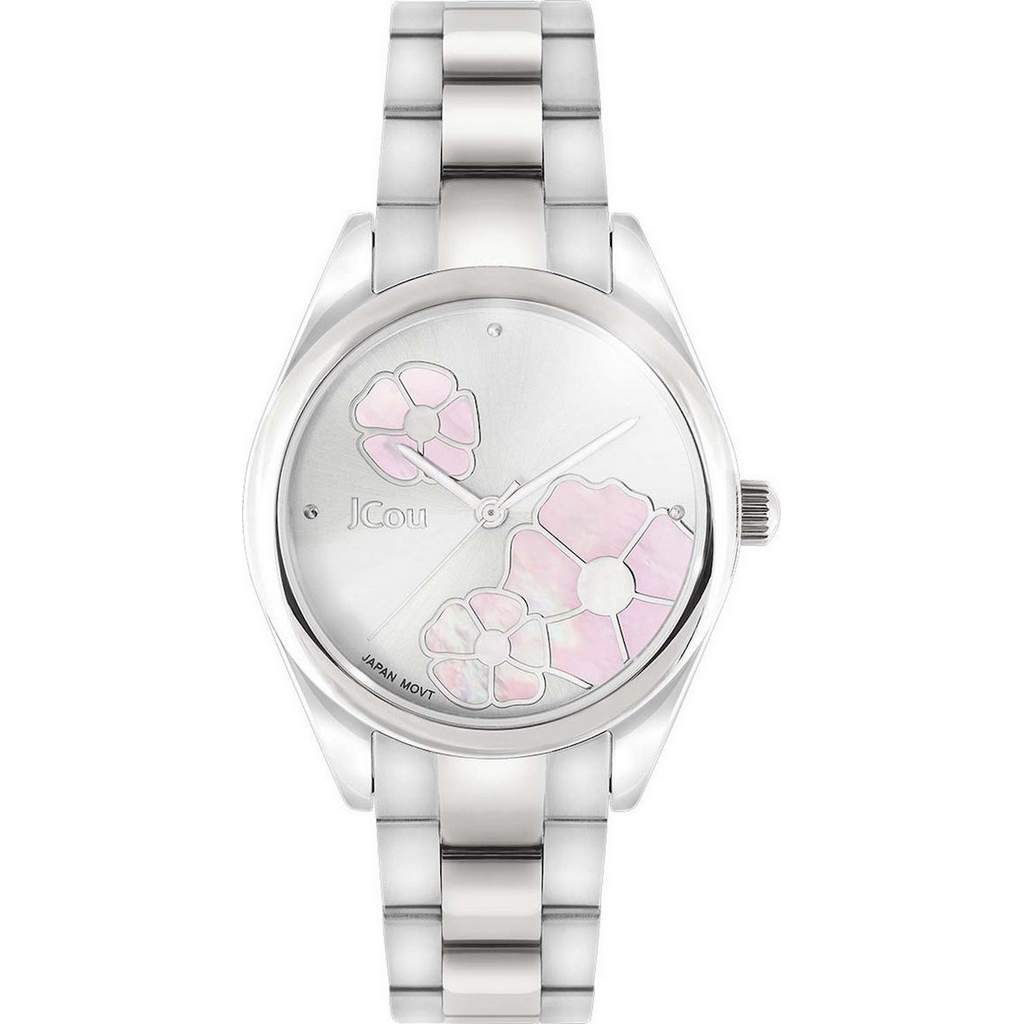 Θελκτικό Γυναικείο Ρολόι JCou ατσάλινο και καντράν με λουλούδια από ροζ φίλντισι.