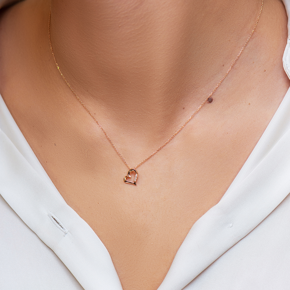 Κολιέ rose gold Κ14 με κρεμάστή καρδούλα στολισμένη με λευκές πέτρες ζιργκόν.