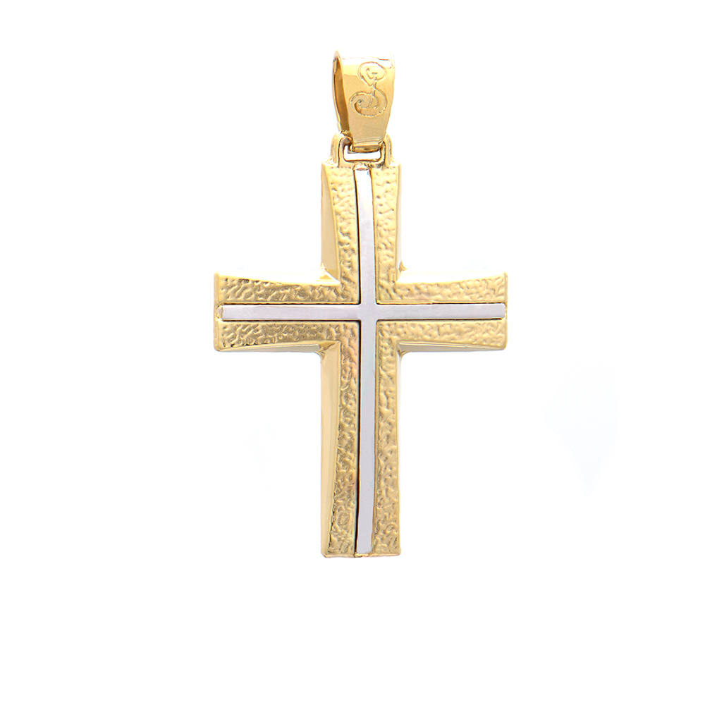 Χρυσός σταυρός 14 καρατίων με ματ φινίρισμα,δίχρωμος, ιδανικός για δώρο βάπτισης για αγόρι.